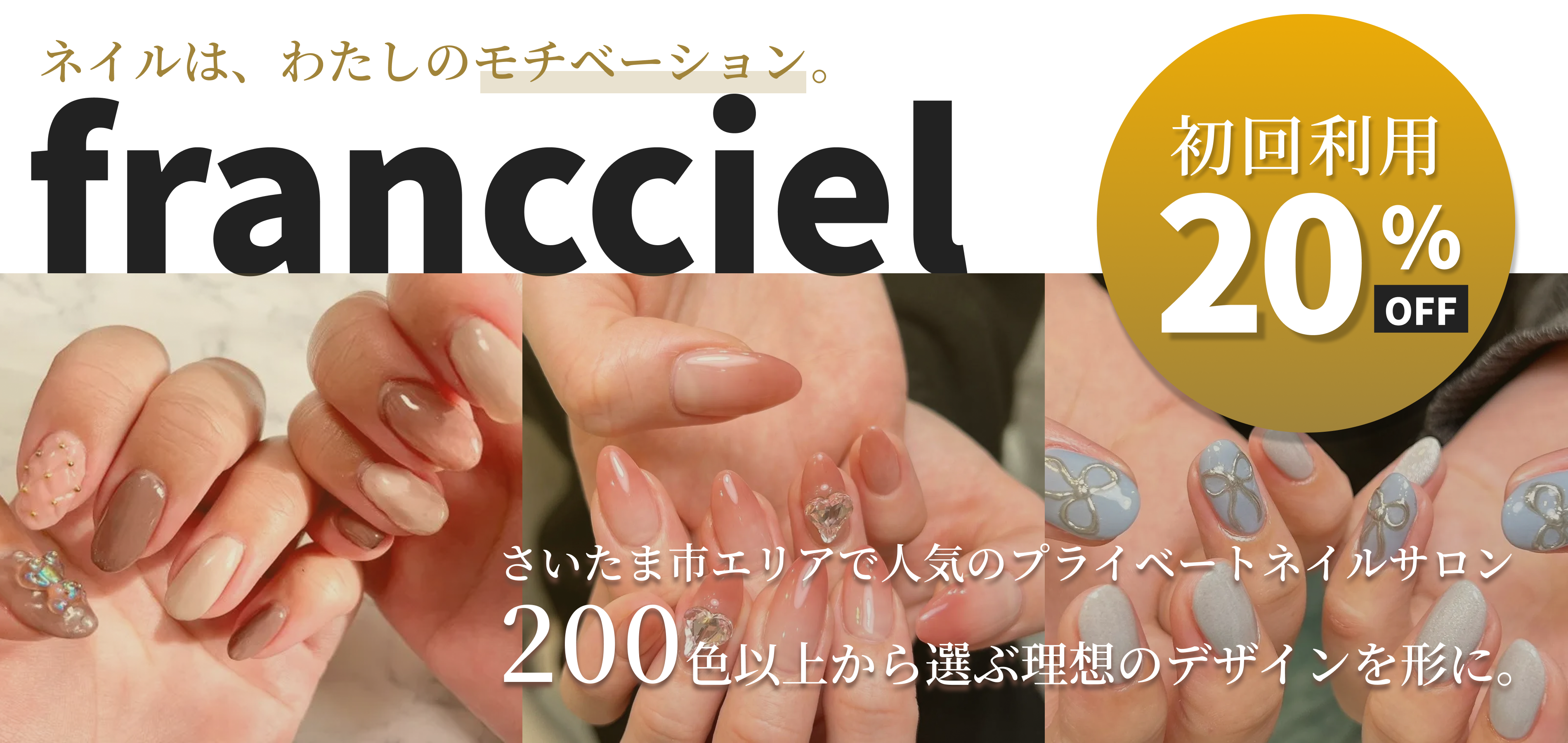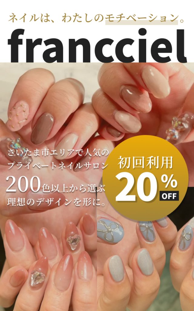 「francciel-フラン・シエル-」は、住宅街に佇む完全予約制のプライベートネイルサロンです。白を基調とした清潔感ある空間で、周囲を気にせずゆったりと施術を受けていただけます。流行を取り入れたトレンドデザインから、オフィスでも楽しめる上品ネイル、個性派アートまで幅広く対応。ネイルを通して心がほどける時間をご提供します。